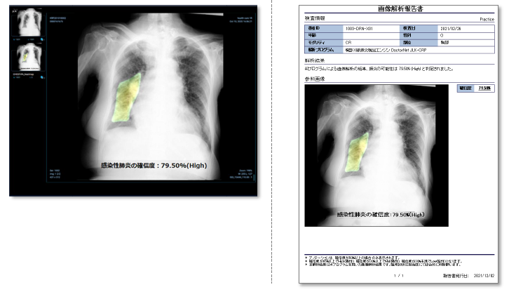 胸部X線画像を自動解析し、肺炎の画像所見の有無を検出します。