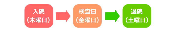 当院の検査日は金曜日となっていますので、通常は前日の木曜日に入院し診察のうえ、金曜日に検査、土曜日に退院の予定です。